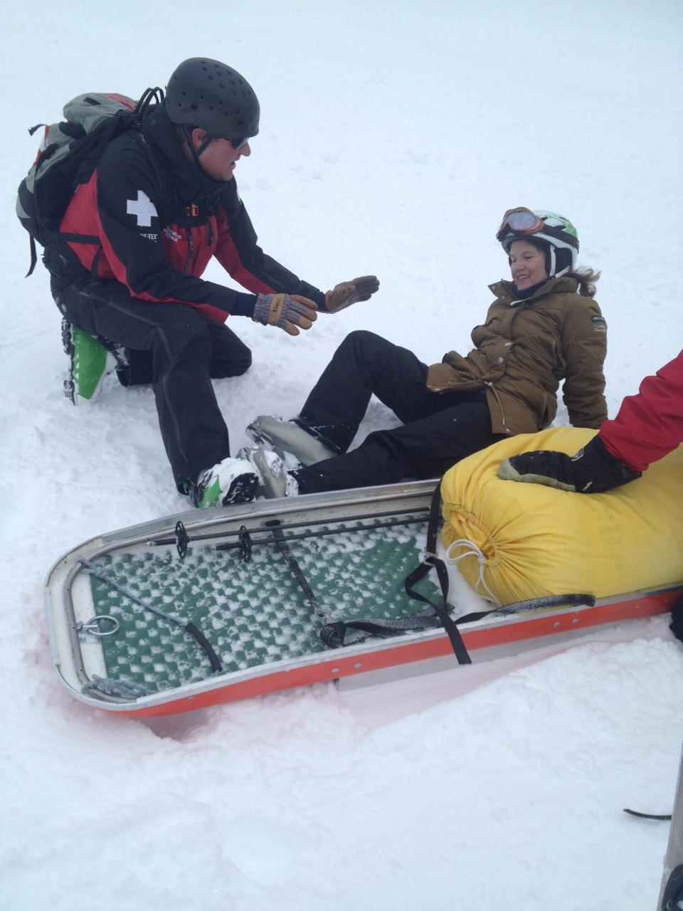 By the time the ski patrol arrived, I had progressed from panicked to embarrassed. The ski patrol, however, wanted to take me to the clinic, just in case, so I lay cocooned in the basket and took a ride, feeling silly.
