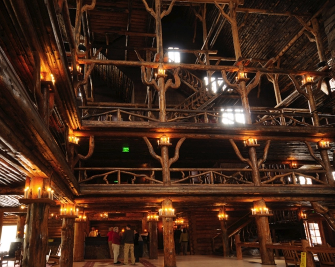 Six hours later we drove up to the world’s largest log chalet :  The Old Faithful Inn.  Other accommodations in Yellowstone are fine, but this 100+-year-old structure will blow your mind.  If you can’t get into The Old Faithful Inn, postpone your trip.