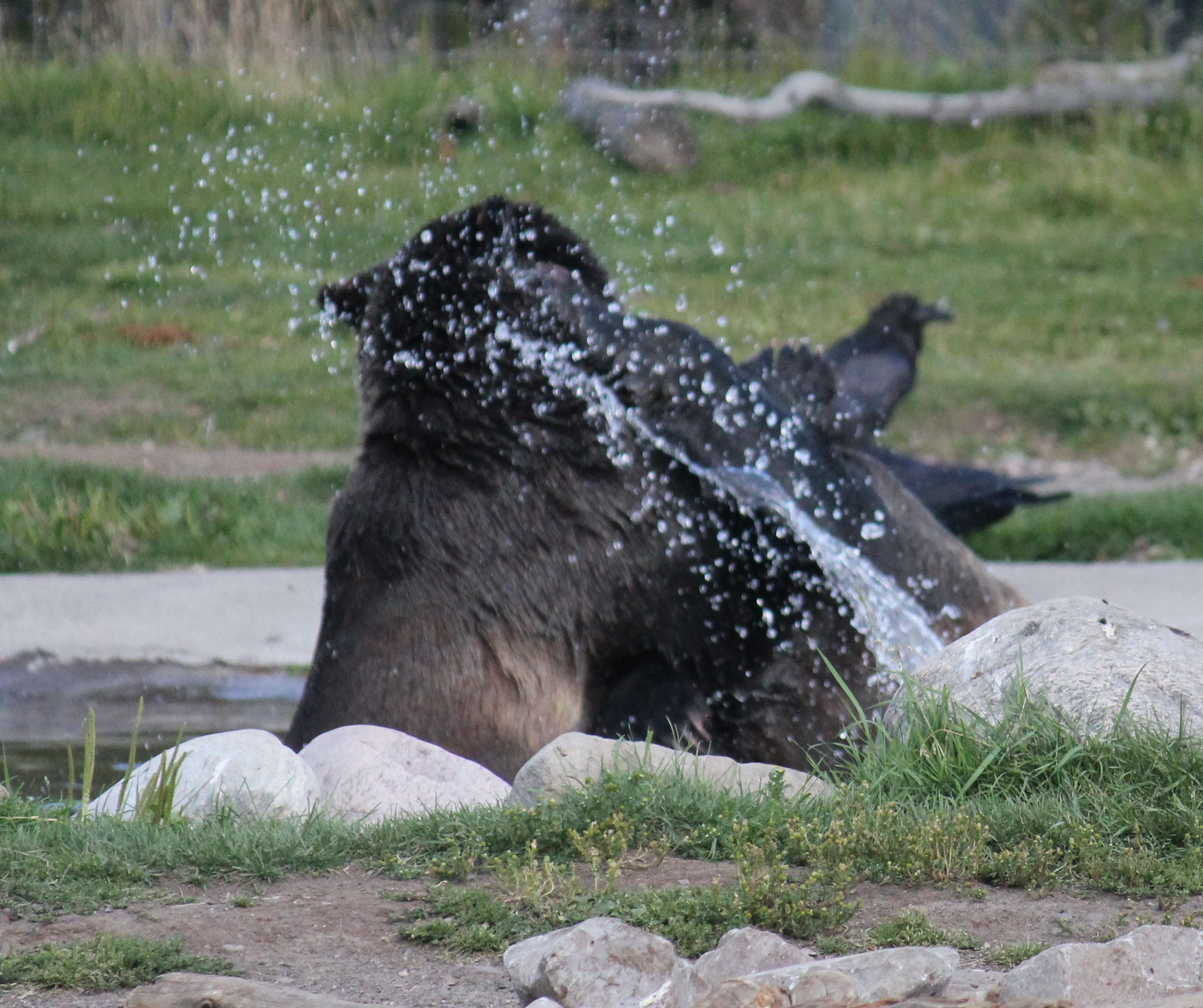 Meanwhile, the bears entertained us by playing in the habitat behind the speaker, wrestling, splashing and ignoring ravens who stand around criticizing them.